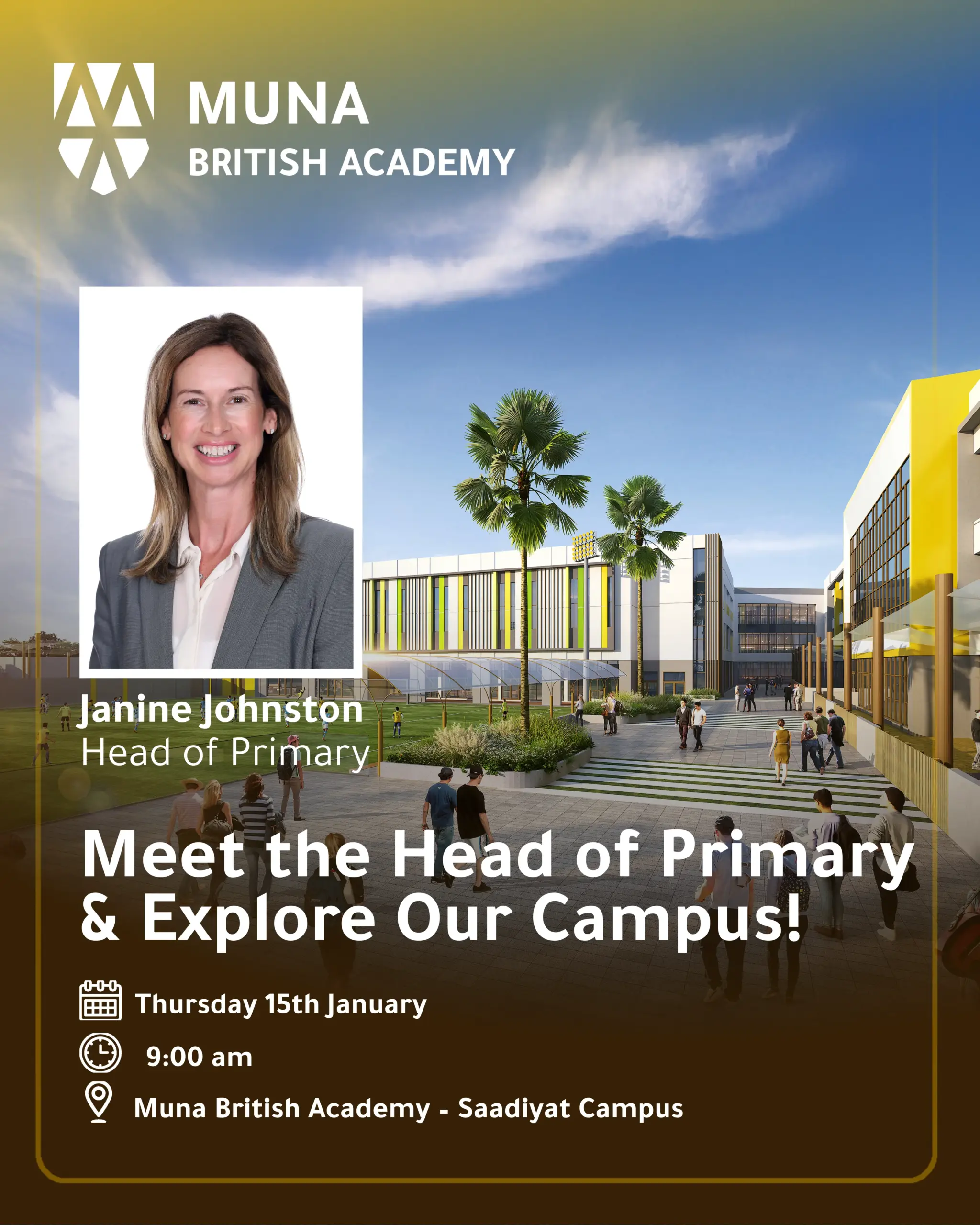 Everything that we do at Muna British Academy is based on the solid foundations of our values: Excellence, Creativity, Passion, Respect and Collaboration. As we transition from our current site to our new home on Saadiyat, we will hold firmly to both our vision and our promise as we continue to put community at the heart of all we do. I warmly welcome you to look around our website and book a visit to see us, to find out why we may be the right school for your children.